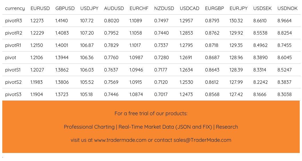 | | | | | FX Strategy 01 Mar 2021 | | | In the G10 FX Market, AUD and NZD are the top gainers today, up 0.56% and 0.5% versus the dollar while CHF and JPY are the top losers, down -0.16% and -0.1% versus the dollar, respectively. In the rates market, global yields were trading mixed today. The US 10-year was trading at 1.417, up 1.0bp. The Japan 10-year was trading at 0.146, down -1.9bp. The German 10-year was trading at -0.289, down -3.2bp. The UK 10-year was trading at 0.784, down -3.9bp. | | | In the Asian equities, markets were trading stronger today. The Nikkei 225 was trading at 29663.5, up 2.41%. The Hang Seng was trading at 29353.0, up 1.29%. In the European equities, indices were trading firm today. The DAX 30 was trading at 13953.35, up 1.21%. The FTSE 100 was trading at 6566.74, up 1.28%. The Euro Stoxx 50 was trading at 3690.26, up 1.48%. | | | Looking at Equity Futures so far,The FTSE100 Futures was trading at 6536.0, up 1.5%. The Euro Stoxx 50 Futures was trading at 3686.0, up 1.63%. The SP500 Futures was trading at 3851.62, up 1.11%. | | | In the Energy space, Oil futures were trading mixed today. The WTI Crude Futures was trading at 62.68, up 1.92%. The Brent Crude Futures was trading at 65.66, down -0.71%. | | | New Bid/Ask WebSocket for FX, CFD's and Crypto - For 14 Day Free Trial Just Click This Link & Follow The Simple Steps https://marketdata.tradermade.com/docs/streaming-data-api | | | 10-Year Yields Daily Chart (1-month) | | | | | | | Daily FX Pivots | | | | | | | Brent Crude Daily Chart (1-month) | | | | | | | Forex Chart and Technical Analysis | | | EURUSD Chart (Two-week) | | | | | | | Strategy: Resistance at 1.2106 for 1.2027 Short-term view: EURUSD resistance comes in at 1.2106 MACD and RSI have a bearish bias. Hence, we see a dip to 1.2027 enter at 1.208. Above 1.2106 to open 1.215 | | | GBPUSD Chart (Two-week) | | | | | | | Strategy: Resistance at 1.4001 for 1.3862 Short-term view: GBPUSD MACD and RSI are flat but resistance comes in at 1.4001 and we see a dip to 1.3862 enter at 1.3955. Above 1.4001 to open 1.4083 | | | USDJPY Chart (Two-week) | | | | | | | Strategy: Resistance at 106.87 for 106.36 Short-term view: USDJPY MACD and RSI are flat but resistance comes in at 106.87 and we see a dip to 106.36 enter at 106.7. Above 106.87 to open 107.2 | | | AUDUSD Chart (Two-week) | | | | | | | Strategy: Resistance at 0.7829 for 0.7637 Short-term view: AUDUSD resistance comes in at 0.7829 MACD and RSI have a bearish bias. Hence, we see a dip to 0.7637 enter at 0.7766. Above 0.7829 to open 0.7952 | | | | | | TraderMade Kingfisher House, 21-23 Elmfield Rd Bromley, Kent, BR1 1LT, United Kingdom E: info@tradermade.com T: +44(0)20 8313 0092 S: 0800 298 2520 (24hr) | | | | | | | | | | | The FXNavigator On-line Research Service (the "Service") is provided by Tradermade Systems Ltd ("TraderMade"). The Service is comprised of annotated charts ("Charts"), technical commentary ("Commentary"), TraderMade strategies ("Strategies") and technical alerts ("Alerts"). The Service is delivered to end-users through a variety of mechanisms, including but not limited to TraderMade's own proprietary platforms, Thomson Reuters own proprietary platforms, email, RSS, Twitter, Facebook and LinkedIn. This document outlines TraderMade's specific disclaimers about usage of the content of this Service. TraderMades General Terms and Conditions for use of the service are located here: Terms and Conditions. TraderMade is an independent information supplier and does not provide trading accounts or hold any Clients funds or monies for trading or trading related activities. General nature of the Service. The content of this Service is of a general nature without specific knowledge of any end-users personal or financial circumstances and is therefore presented for the end-user viewers information and entertainment only. Any trading Strategies outlined in the Service are no more than the opinions of Analysts and are hypothetical disclosures based upon general predictions and interpretations of the Market being analysed. Service Delivery and Delays. The content of the Service is delivered as quickly as is reasonably possible using multiple routing venues and internet technologies. By using the Service, end-users acknowledge that the Service may be delayed for reasons beyond the reasonable control of TraderMade. For the avoidance of doubt, each part of the Service is current only as at the date and time shown on the part in question, not the date and time delivered and not the time first viewed by the end-user. Indicative Prices. Charts, Alerts and other quantitative Market information supplied within the Service are based upon the market data that is supplied to TraderMade by reputable third parties, and TraderMade use this information in the Service in good faith. TraderMade provide no assertion or warrantee that prices or market levels indicated in any part of the Service will in fact be reflected in any exchange, any market place or any trading platform. Markets Trading Trading or investing in any market-traded financial instrument, including foreign exchange, contains significant levels of inherent financial risk. End Users involved in trading activities may lose some or all of the money they invest in those trading activities, and in certain cases may lose more than they have invested. TraderMade strongly recommend that all end-users take independent advice from a financial or trading professional who is apprised of their individual circumstances before commencing trading activities. Only true discretionary income should be used for trading in the Foreign Exchange market. If you are considering trading in the Foreign Exchange market before you trade make sure you understand how the spot market operates and be thoroughly familiar with the operation of and the limitations of the platform on which you are going to trade. No parts of the Service, including the Strategies, are a solicitation or enticeme