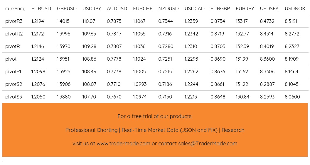 | | | | | FX Strategy 30 Apr 2021 | | | In the G10 FX Market, JPY and USD are the top gainers today while NOK and GBP are the top losers, down -0.27% and -0.26% versus the dollar, respectively. In the rates market, global yields were trading mixed today. The US 10-year was trading at 1.644, up 0.1bp. The Japan 10-year was trading at 0.087, flat 0.0bp. The UK 10-year was trading at 0.833, down -1.15bp. The German 10-year was trading at -0.204, down -1.2bp. | | | In the Asian equities, markets were trading weak today. The Kospi was trading at 3147.86, down -0.83%. The Nikkei 225 was trading at 28812.63, down -0.83%. The Hang Seng was trading at 28675.37, down -2.14%. In the European equities, indices were trading firm today. The DAX 30 was trading at 15234.35, up 0.53%. The FTSE 100 was trading at 6976.05, up 0.21%. The Euro Stoxx 50 was trading at 4000.21, up 0.08%. | | | Looking at Equity Futures so far,The FTSE100 Futures was trading at 6943.2, up 0.17%. The Euro Stoxx 50 Futures was trading at 3963.0, up 0.18%. The SP500 Futures was trading at 4191.62, down -0.28%. | | | In the Energy space, Oil futures were trading weak today. The WTI Crude Futures was trading at 64.56, down -0.69%. The Brent Crude Futures was trading at 67.74, down -1.2%. | | | 10-Year Yields Daily Chart (1-month) | | | | | | | Daily FX Pivots | | | | | | | Brent Crude Daily Chart (1-month) | | | | | | | Forex Chart and Technical Analysis | | | EURUSD Chart (Two-week) | | | | | | | Strategy: Resistance at 1.2124 for 1.2076 Short-term view: EURUSD resistance comes in at 1.2124 MACD and RSI have a bearish bias. Hence, we see a dip to 1.2076 enter at 1.2108. Above 1.2124 to open 1.2146 | | | GBPUSD Chart (Two-week) | | | | | | | Strategy: Resistance at 1.3951 for 1.388 Short-term view: GBPUSD resistance comes in at 1.3951 MACD and RSI have a bearish bias. Hence, we see a dip to 1.388 enter at 1.3928. Above 1.3951 to open 1.397 | | | USDJPY Chart (Two-week) | | | | | | | Strategy: Support at 108.49 for 109.28 Short-term view: USDJPY MACD and RSI are flat but support comes in at 108.49 and we see a rise to 109.28 enter at 108.75. Below 108.49 to open 108.07 | | | AUDUSD Chart (Two-week) | | | | | | | Strategy: Resistance at 0.7807 for 0.7738 Short-term view: AUDUSD resistance comes in at 0.7807 MACD and RSI have a bearish bias. Hence, we see a dip to 0.7738 enter at 0.7784. Above 0.7807 to open 0.7847 | | | | | | TraderMade Kingfisher House, 21-23 Elmfield Rd Bromley, Kent, BR1 1LT, United Kingdom E: info@tradermade.com T: +44(0)20 8313 0092 S: 0800 298 2520 (24hr) | | | | | | | | | | | The FXNavigator On-line Research Service (the "Service") is provided by Tradermade Systems Ltd ("TraderMade"). The Service is comprised of annotated charts ("Charts"), technical commentary ("Commentary"), TraderMade strategies ("Strategies") and technical alerts ("Alerts"). The Service is delivered to end-users through a variety of mechanisms, including but not limited to TraderMade's own proprietary platforms, Thomson Reuters own proprietary platforms, email, RSS, Twitter, Facebook and LinkedIn. This document outlines TraderMade's specific disclaimers about usage of the content of this Service. TraderMades General Terms and Conditions for use of the service are located here: Terms and Conditions. TraderMade is an independent information supplier and does not provide trading accounts or hold any Clients funds or monies for trading or trading related activities. General nature of the Service. The content of this Service is of a general nature without specific knowledge of any end-users personal or financial circumstances and is therefore presented for the end-user viewers information and entertainment only. Any trading Strategies outlined in the Service are no more than the opinions of Analysts and are hypothetical disclosures based upon general predictions and interpretations of the Market being analysed. Service Delivery and Delays. The content of the Service is delivered as quickly as is reasonably possible using multiple routing venues and internet technologies. By using the Service, end-users acknowledge that the Service may be delayed for reasons beyond the reasonable control of TraderMade. For the avoidance of doubt, each part of the Service is current only as at the date and time shown on the part in question, not the date and time delivered and not the time first viewed by the end-user. Indicative Prices. Charts, Alerts and other quantitative Market information supplied within the Service are based upon the market data that is supplied to TraderMade by reputable third parties, and TraderMade use this information in the Service in good faith. TraderMade provide no assertion or warrantee that prices or market levels indicated in any part of the Service will in fact be reflected in any exchange, any market place or any trading platform. Markets Trading Trading or investing in any market-traded financial instrument, including foreign exchange, contains significant levels of inherent financial risk. End Users involved in trading activities may lose some or all of the money they invest in those trading activities, and in certain cases may lose more than they have invested. TraderMade strongly recommend that all end-users take independent advice from a financial or trading professional who is apprised of their individual circumstances before commencing trading activities. Only true discretionary income should be used for trading in the Foreign Exchange market. If you are considering trading in the Foreign Exchange market before you trade make sure you understand how the spot market operates and be thoroughly familiar with the operation of and the limitations of the platform on which you are going to trade. No parts of the Service, including the Strategies, are a solicitation or enticement by TraderMade or any person or any organisation to transact any financial instrument now or at any time in the future. Due to the inherent risks and unk